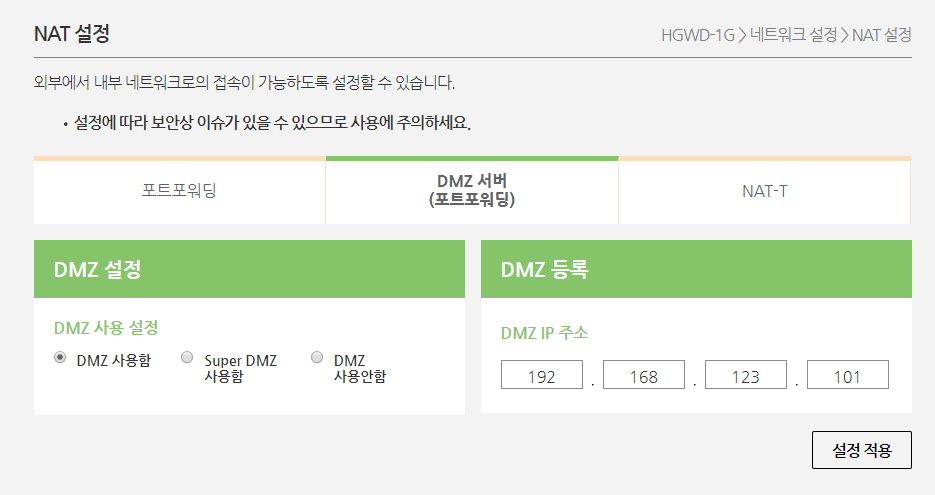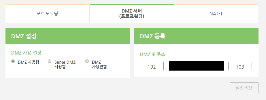 이제 아래에 보시는 곳을 눌러 DMZ 서버를 설정해줘야 하는데, 순서는 아래와 같습니다.