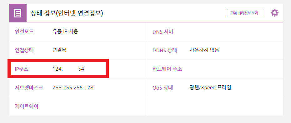 IP주소는 공유기 상태 정보에서 확인할 수 있습니다.