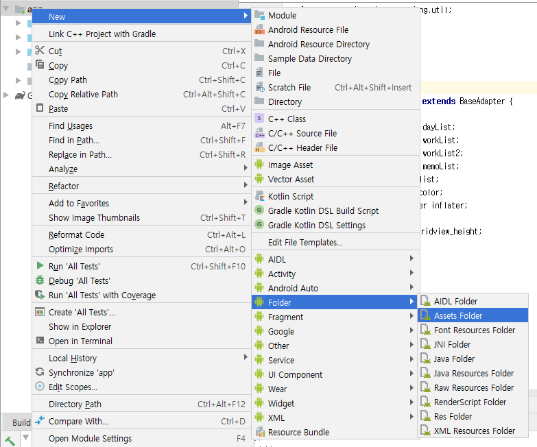 안드로이드 스튜디오는 기본적으로 assets 폴더가 없기 때문에 추가해줘야 합니다.