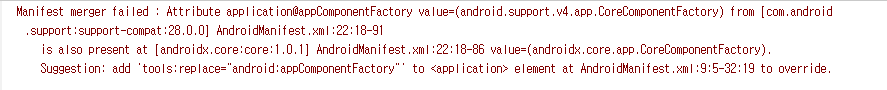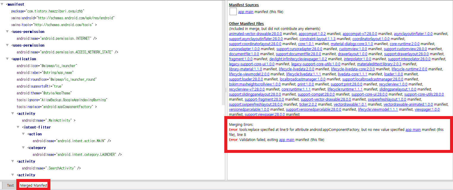 아래 Merged Manifest를 눌러보시면 오른쪽에 에러 문구가 보이실 겁니다.