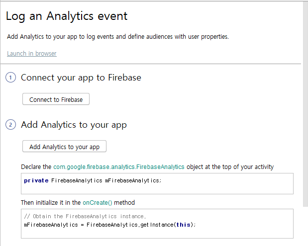 가장 위에 있는 Analytics를 눌러보면 Log an Analytics event가 있어요. 클릭해줍니다.