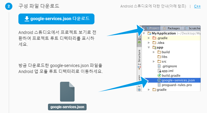 여기서 google-services.json을 다운로드하여 어플 내에 넣어주겠습니다.