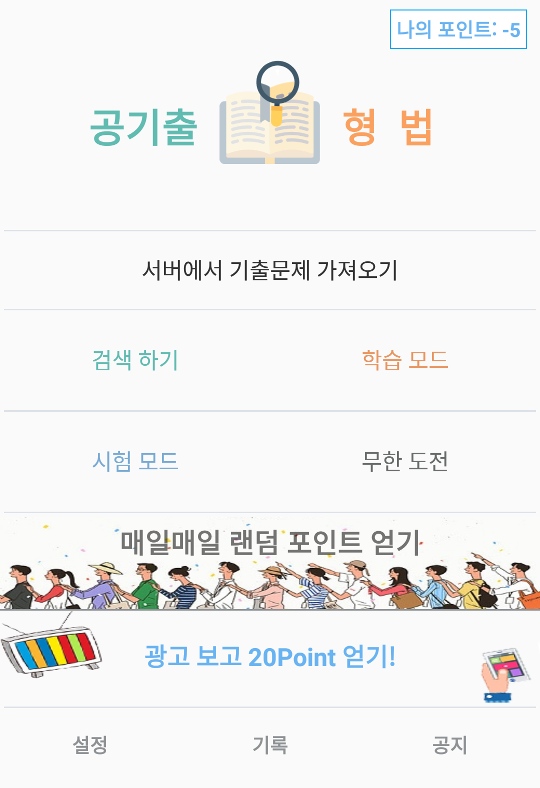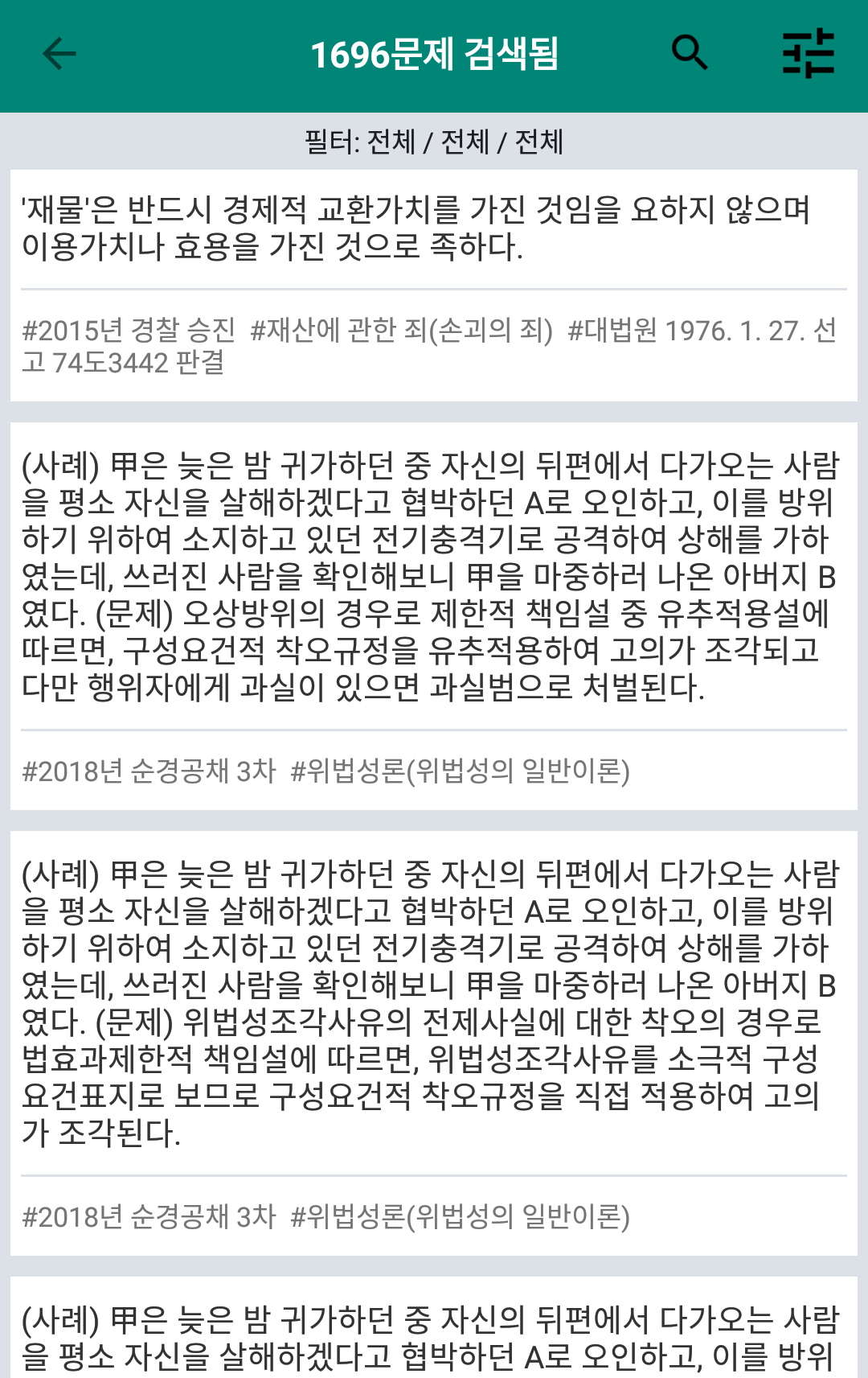 - 형법(1696문제) - 추후 과목 추가 예정!!! * 공무원 시험의 핵심은 기출문제의 지문 하나하나를 완벽하게 학습하는 것입니다. * 공기출은 독서실뿐만 아니라 지하철, 버스 등 언제 어디서나 학습할 수 있으며 효율적인 학습법으로 단시간에 많은 양을 공부할 수 있게 해줍니다. 그때 그 지문.. 답이 뭐였더라? 기출문제집 통째로 찾아봐야하나.. 하고 막막할 때가 자주 있죠? 검색하기에서는 궁금한 문제를 키워드로 순식간에 검색 할 수 있습니다. 출제 정보