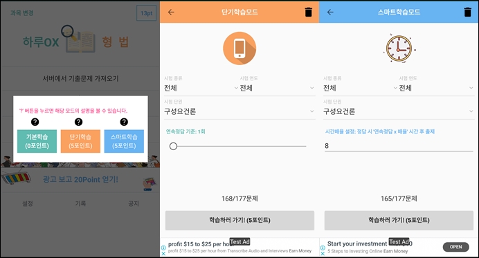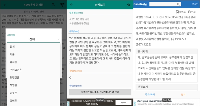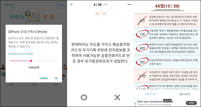 아직 문제의 양이 다소 부족한 면이 있지만, 지속적으로 업데이트 중이기 때문에 기출문제집 대용으로도 손색이 없습니다. 하루기출 어플로 형법 기출문제, 형소법 기출문제, 한국사 기출문제를 마스터해 보세요!^^